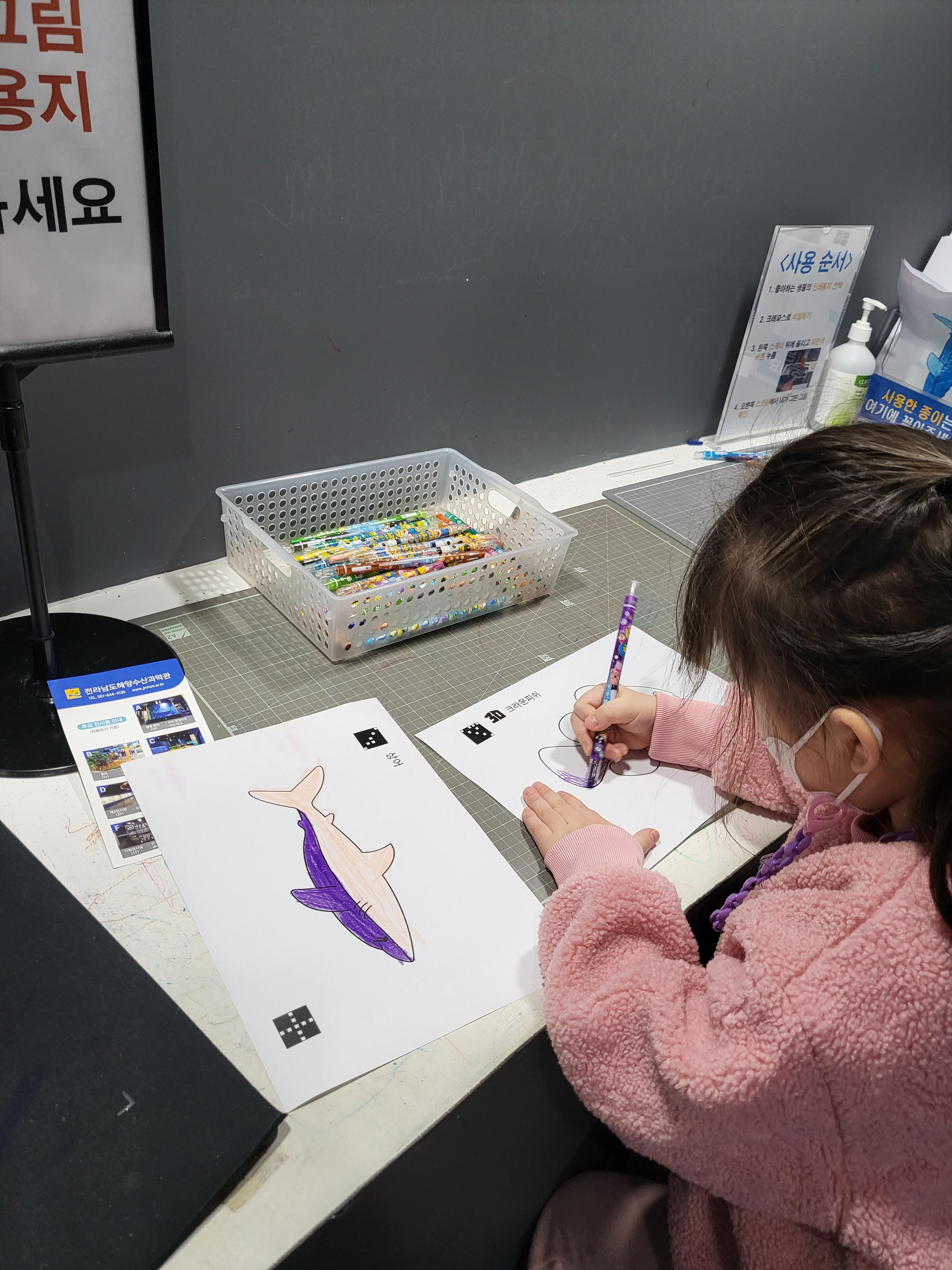여기도 물고기 먹이체험, 색칠공부해서 스크린에 전송하기 더 놀수있어서 좋았어요 :)